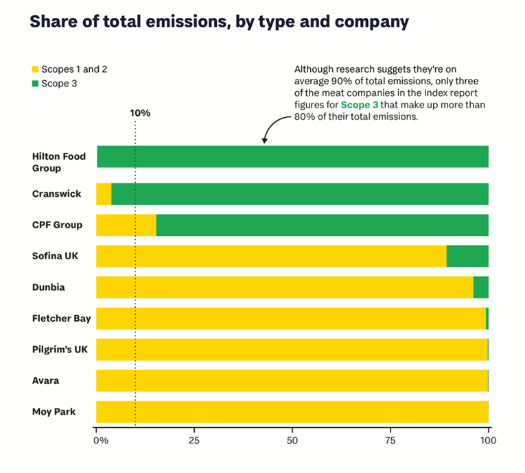 Pilgrim’s UK, a pork and lamb producer, reported just 105 tonnes of Scope 3 emissions in 2021, accounting for 0.21% of its total emissions. That’s 250 times less than the amount reported by Hilton Food Group, a beef and lamb company.